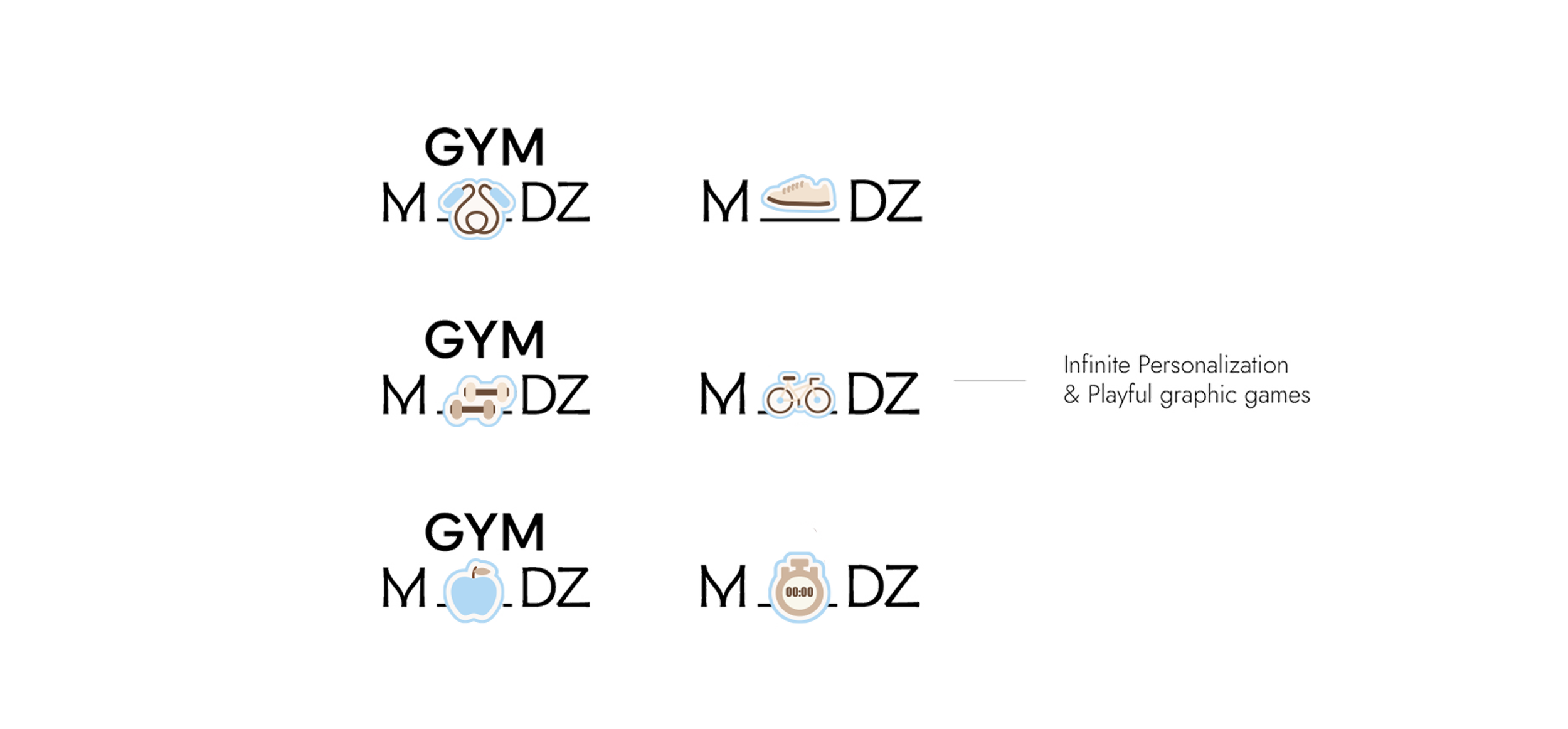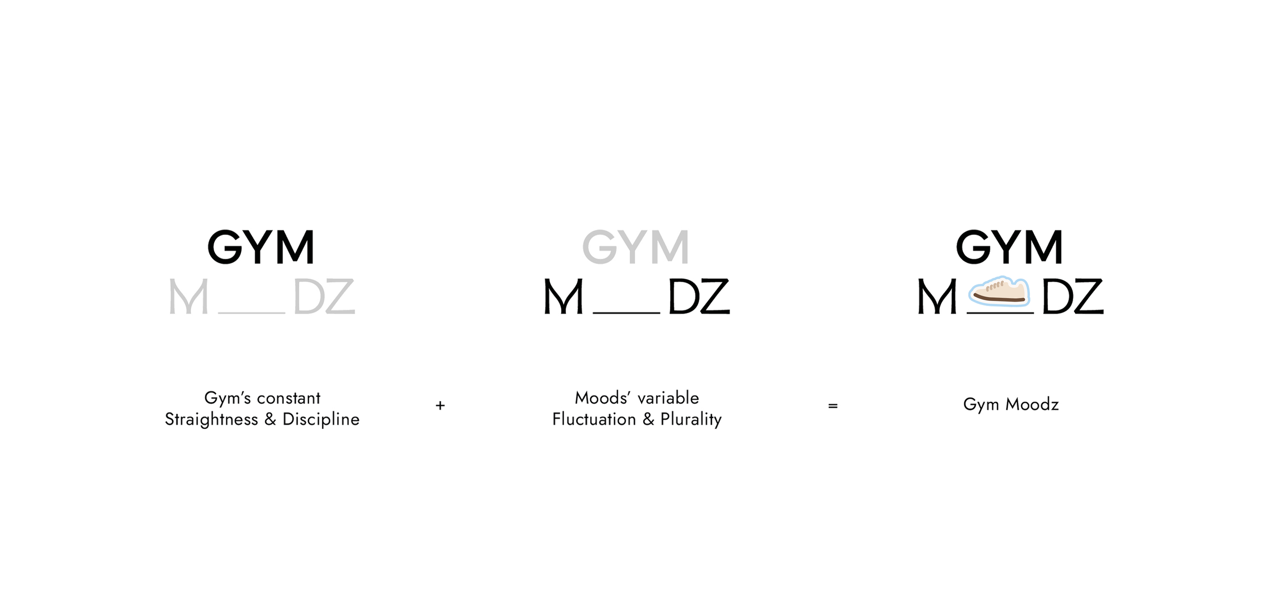 Toute l’identité repose sur la dualité entre le “Gym” - rigueur et performance- et les “Moodz” reflets de nos émotions changeantes. Ce dialogue se retrouve dans le logo GYM M___DZ, où l’espace vide incarne la part fluctuante de nos humeurs tandis que la structure droite exprime la constance du sport.